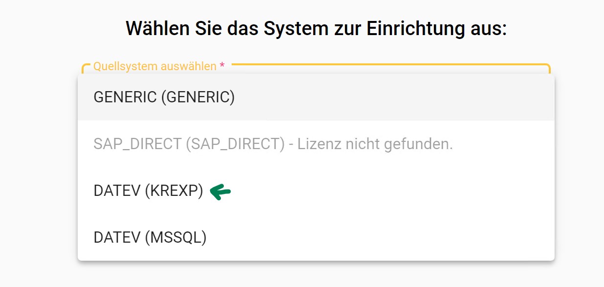 Wählen Sie als Quellsystem der neuen Datenquelle “DATEV (KREXP)” aus und starten sie die Einrichtung.