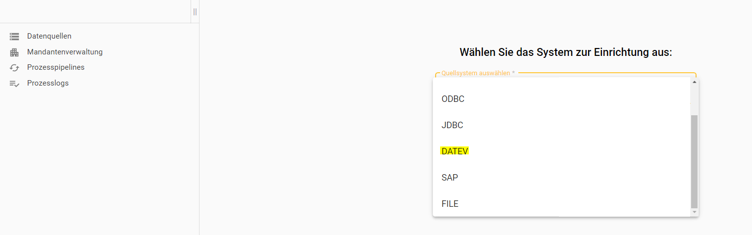 Wählen sie als Quellsystem die neuen Datenquelle “DATEV” aus und starten sie die Einrichtung.