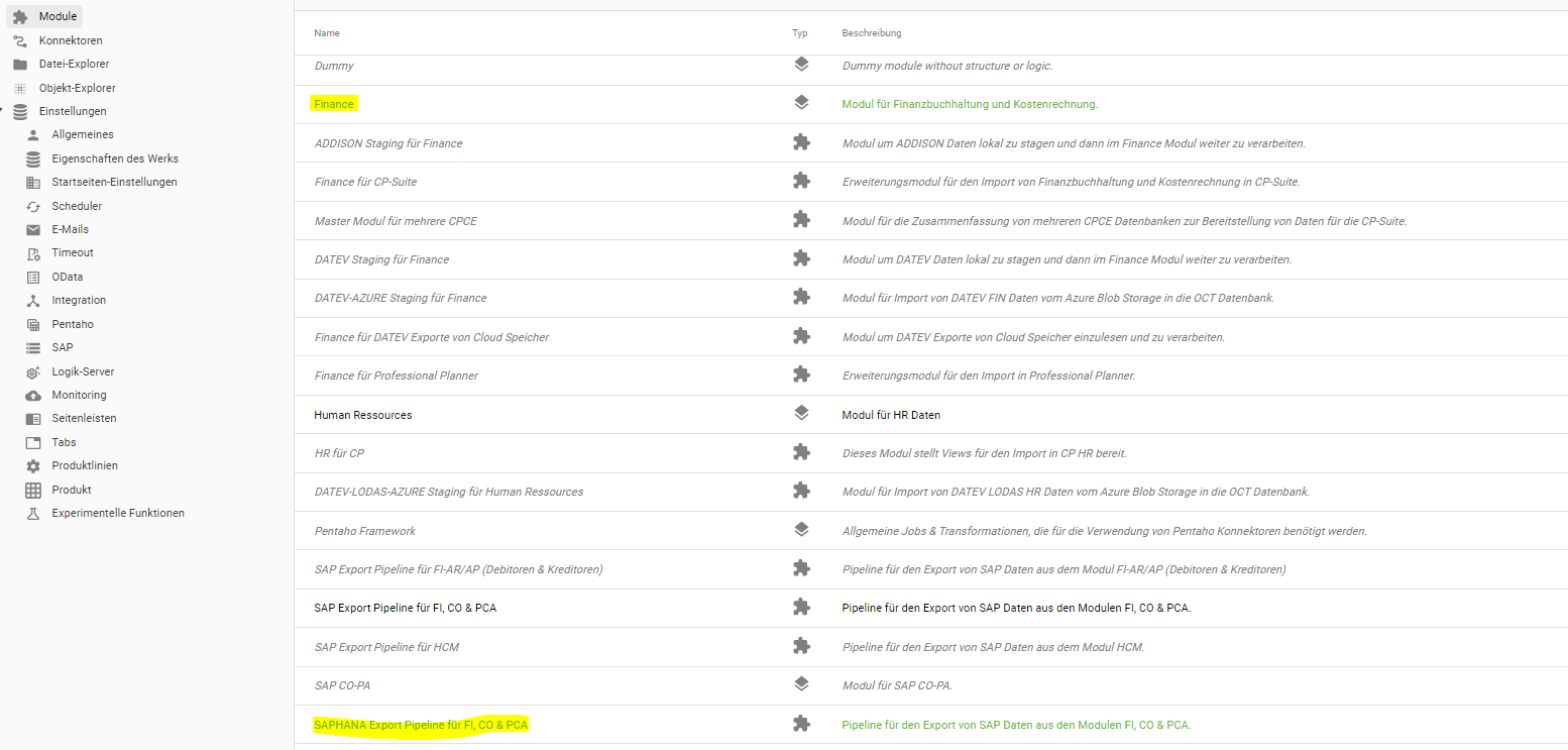 Das Modul “SAP Export Pipeline für FI, CO & FCA” legt automatisch eine Pipeline in der Pipeline-Übersicht an: