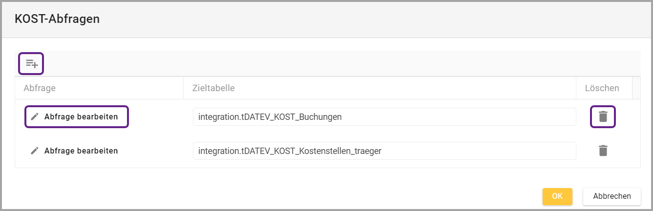 Bei Auswahl des Buttons “KOST-Abfragen definieren” öffnet sich ein Dialog, in welchem definierte Abfragen erstellt werden können: