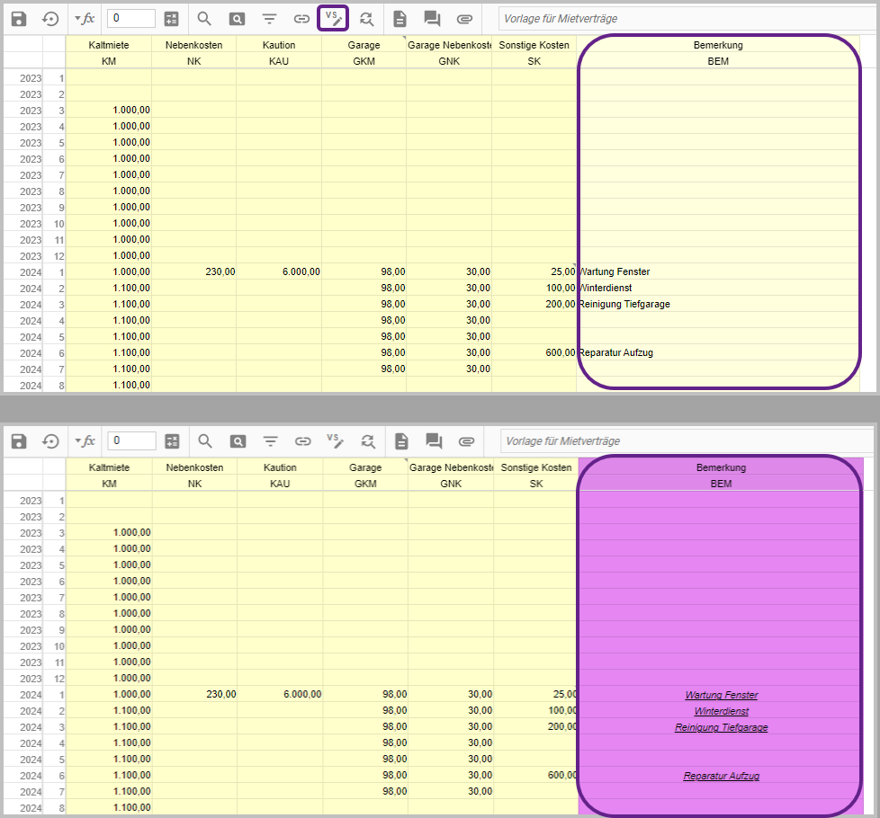 Oben: Format-ID “EingabeText - Unten: Format-ID “HintergrundLila”