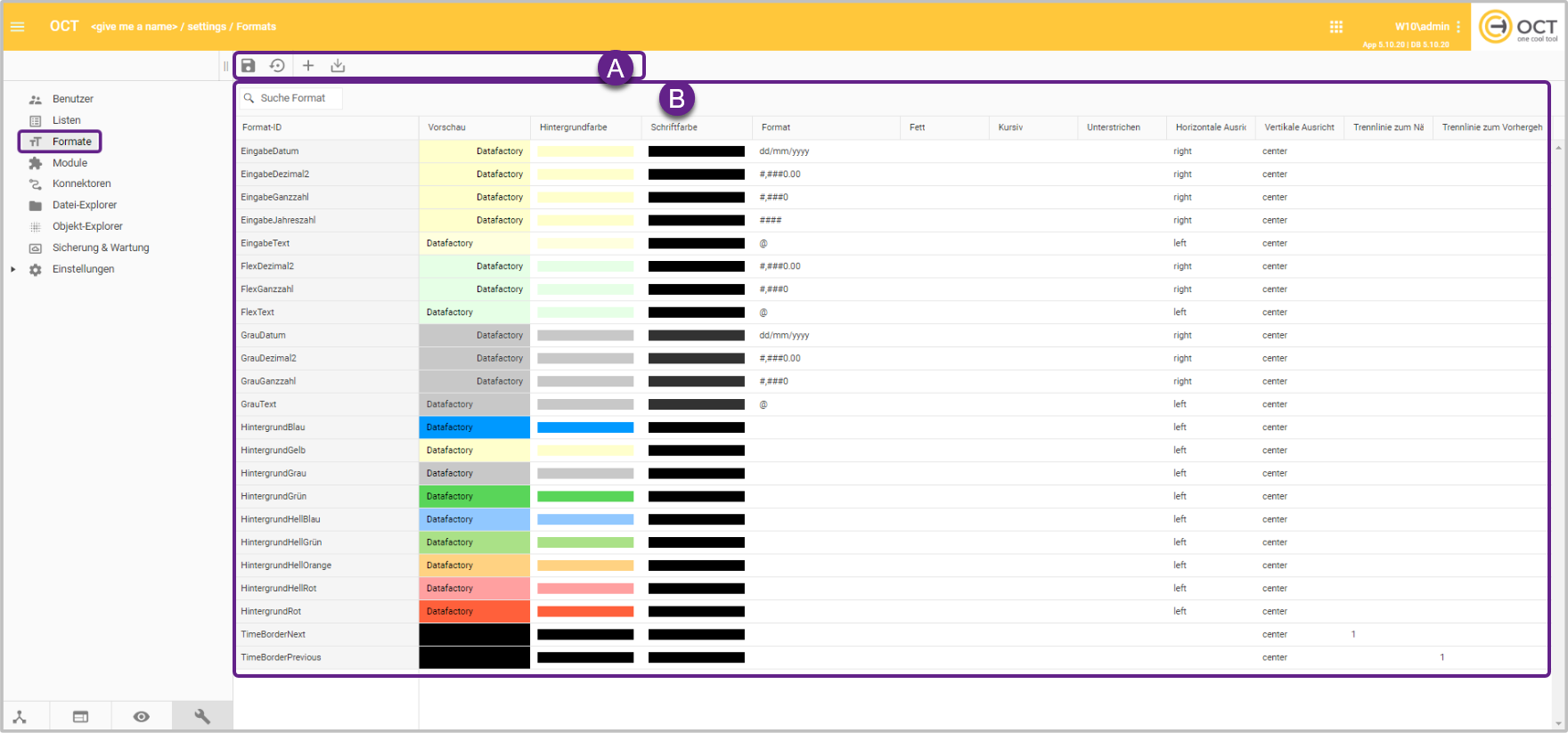 Die Menüleiste mit ihren Funktionen ist für den gesamten Bereich “Formate” anwendbar. Formate können bearbeitet, gespeichert, neu hinzugefügt, exportiert und importiert werden.
