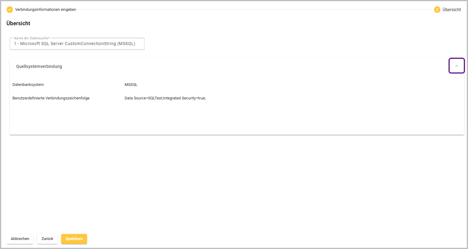 Dieser Schritt zeigt eine Übersicht mit Informationen zum Namen der Datenquelle sowie zur Quellsystemverbindung (über ein aus- und einklappbares Menü) an. Die Informationen basieren auf den im Einrichtungsprozess angegebenen Eigenschaften.