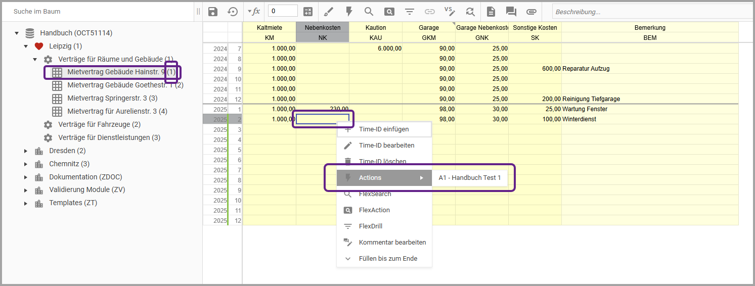“Action” in der Menüleiste oder über das Rechtsklick-Kontextmenü der Zelle ausgeführt bzw. der Feldwert in die Zelle übernommen werden.