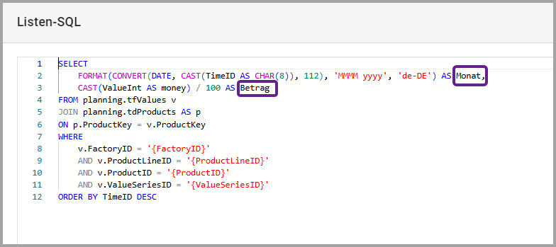 Achten Sie beim Schreiben des SQL-Skripts darauf, dass die einfachen Anführungszeichen bei Variablen korrekt gesetzt werden: z.B. ‘{FactoryID}’ und nicht {FactoryID}.