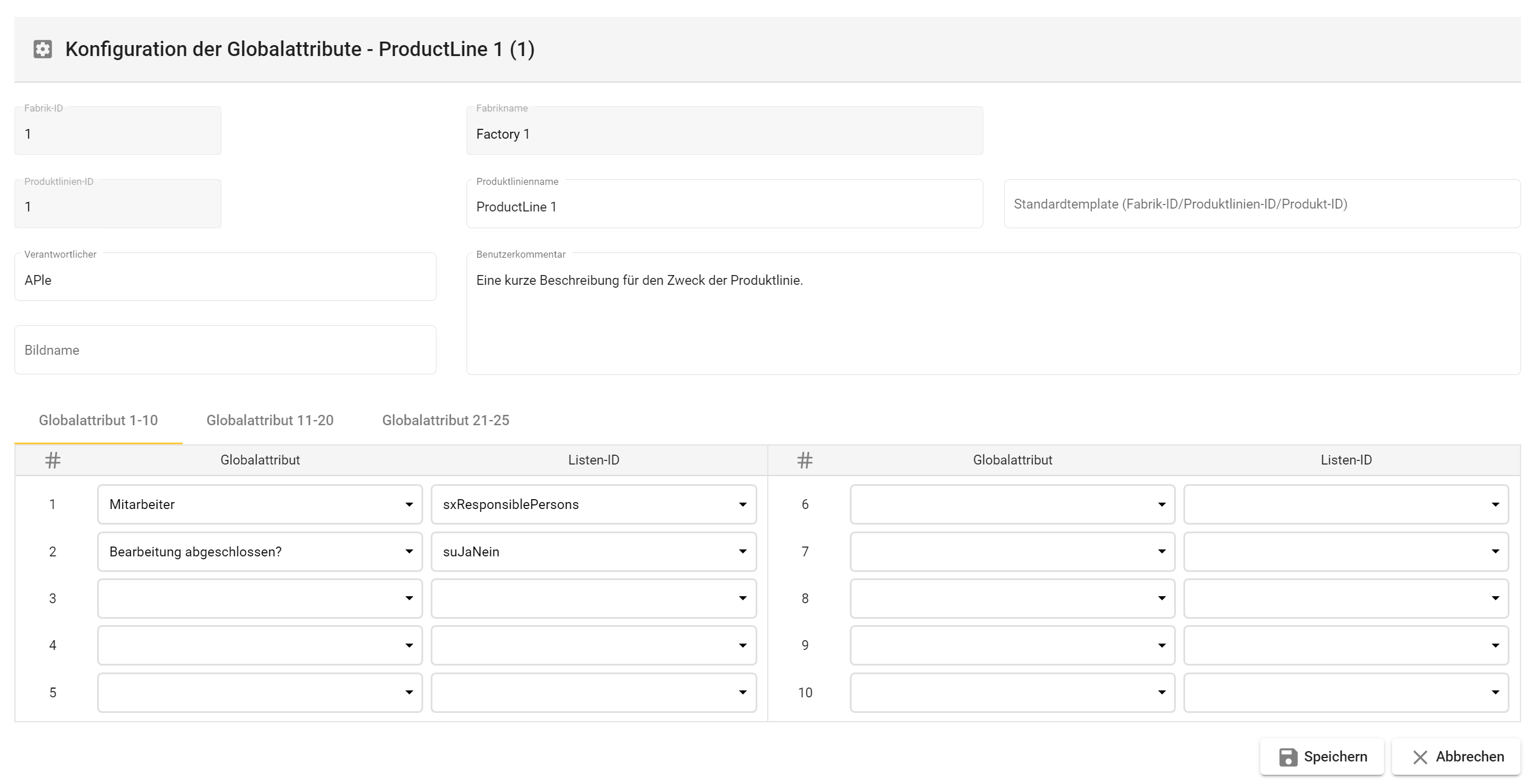 Das Untermenü “Konfiguration der Globalattribute - ….” erlaubt das Erstellen und das Verändern von Globalattributen einer Produktlinie. Diese Eigenschaften von sich auch an anderen Stellen in der Software wieder, z.B. im “Factory”-Tab.