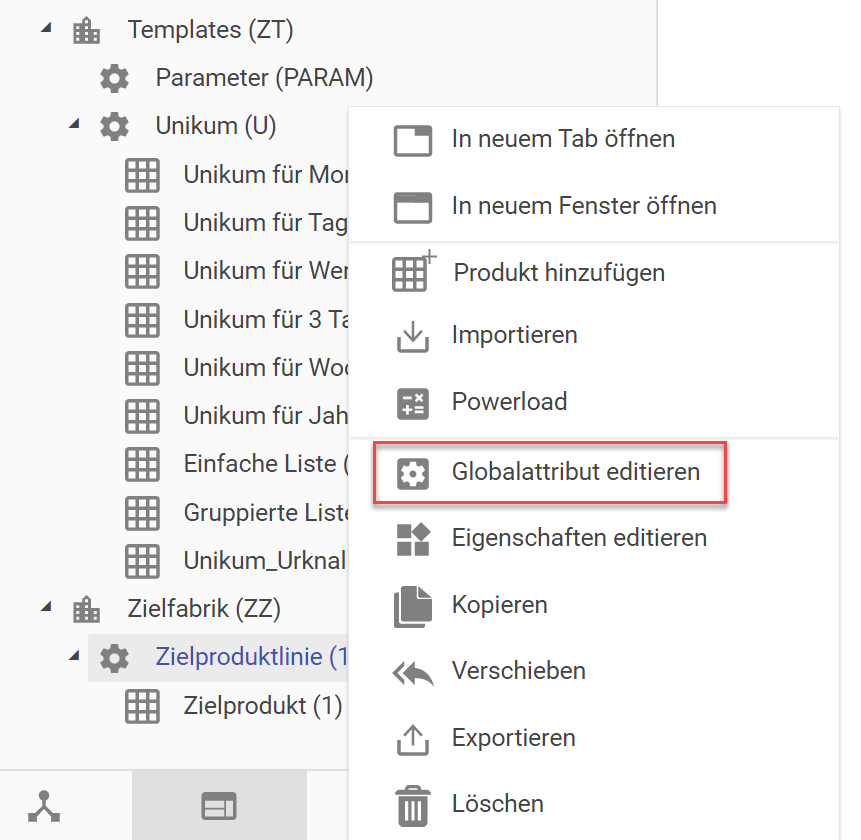 Die Quelle lässt sich in den Globalattributen der gewünschten Produktlinie (hier am Beispiel “Zielproduktlinie (1)” ändern: