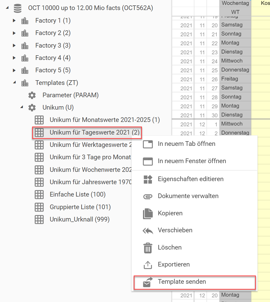 Nach der Aktivierung dieser Planungslösung wird die Template-Fabrik in der Navigationsleiste der Datenerfassung angezeigt & lässt sich mit den Unterebenen ausklappen: