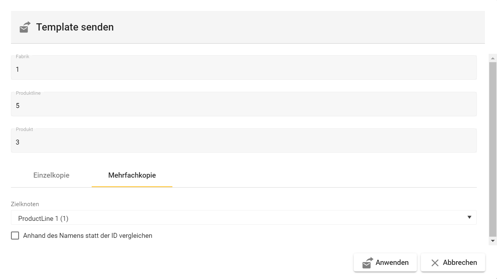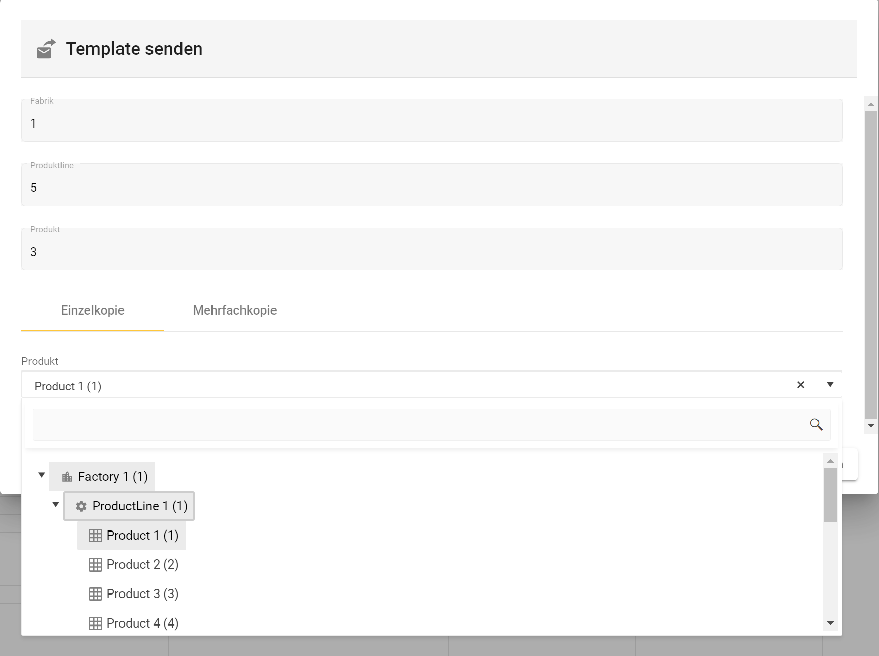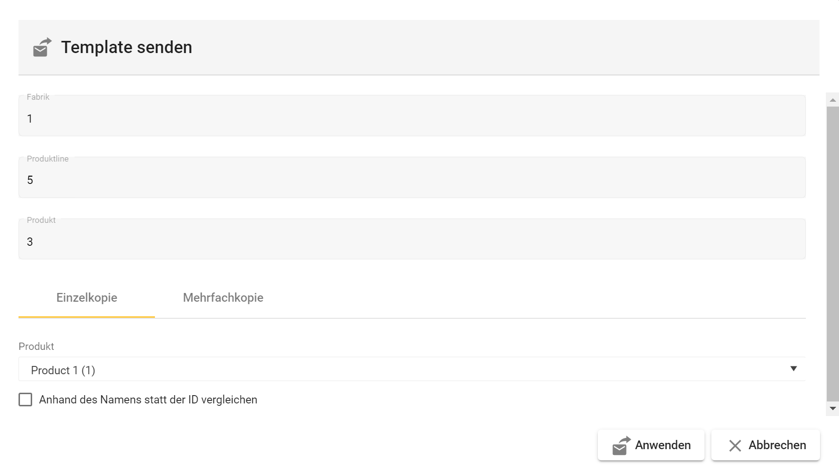 Die Auswahl “Template senden” öffnet ein Untermenü mit den Optionen “Einzelkopie” und “Mehrfachkopie”: