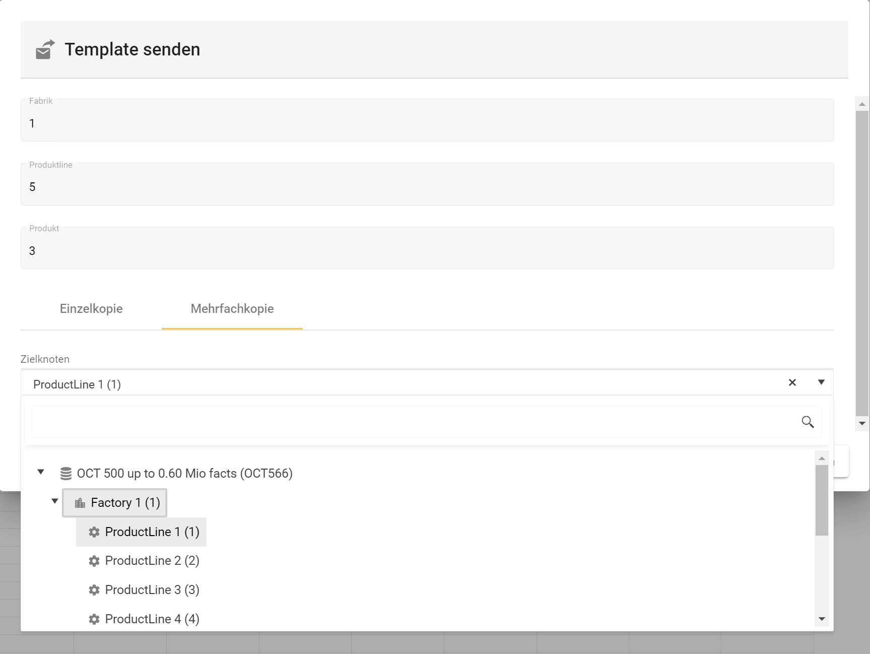 Der Tab “Mehrfachkopie” rollt das ausgewählte Quellprodukt auf alle Produkte in der Zielproduktlinie aus: