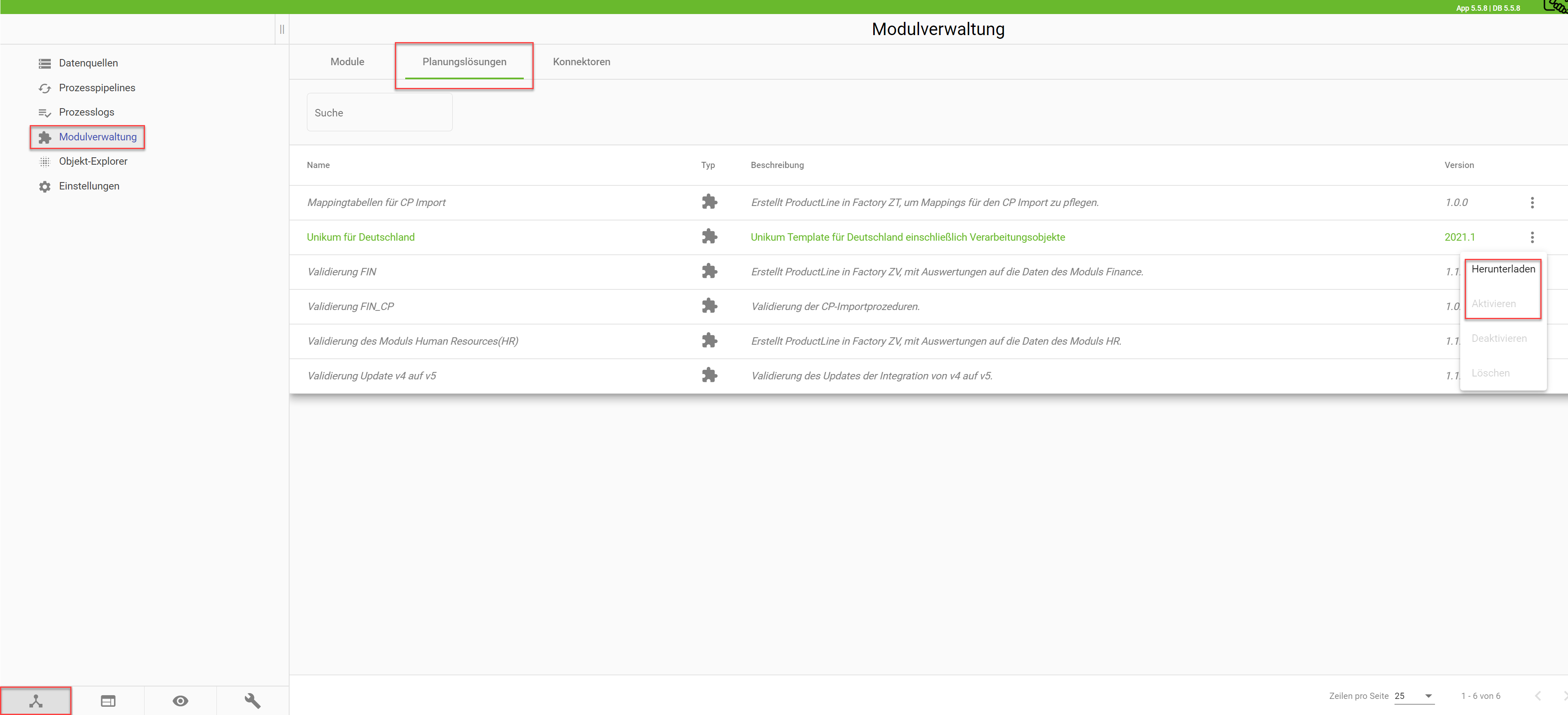 Bei der Software-Auslieferung sind verschiedene Planungslösungen bereits enthalten. Nach der Installation können Sie im Bereich Datenflüsse - Modulverwaltung (siehe Kapitel 4.4.) den Tab “Planungslösungen” öffnen und das “Unikum für Deutschland” (deutschsprachiges Unikum) installieren & aktivieren.