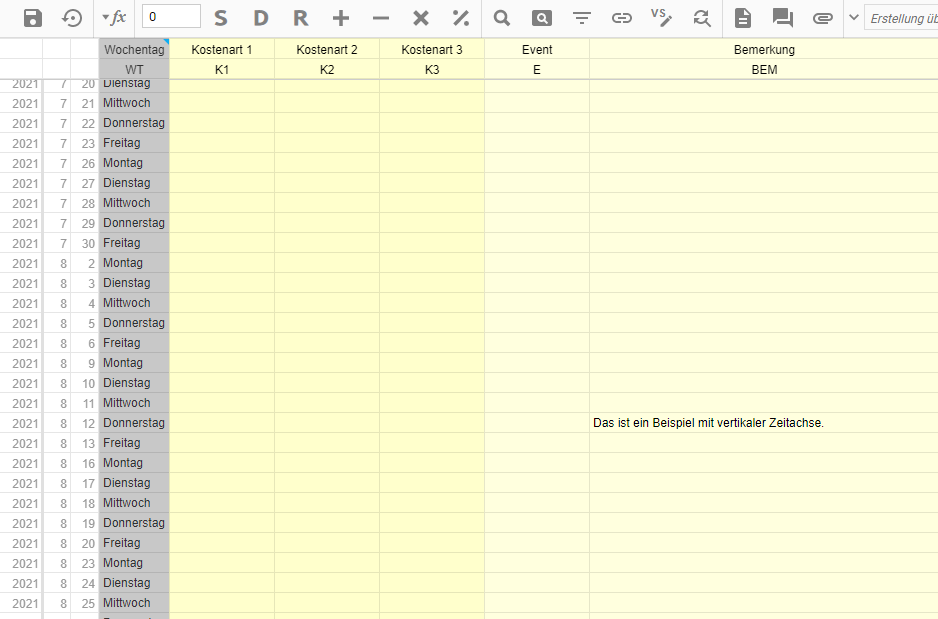 Die Wahl der Zeitachsen-Darstellung hat einen Einfluss auf die Darstellungsweise der einzelnen Zeilen. Bei der Tagesdarstellung wird der letzte Tag des Monats, vom ersten Tag des darauffolgenden Monats, durch eine dicke Rahmenlinie abgegrenzt. Bei der Monatsdarstellung wird der letzte Monat des Jahres, vom ersten Monat des darauffolgenden Jahres, auf diese Art abgegrenzt.