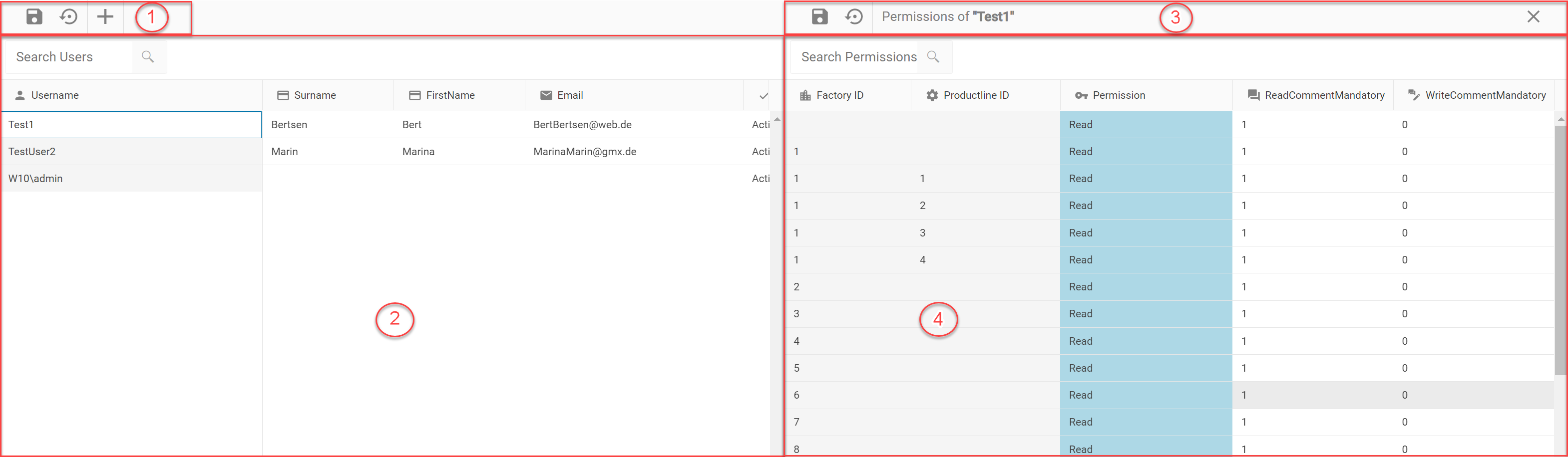 Kommt die gleiche Fabrik-ID in mehreren aufeinanderfolgenden Zeilen vor, dann steuert die oberste Zeile dieser Fabrik-ID, ohne Produktlinien-ID, die Berechtigungen der kompletten Fabrik. Die Zeilen mit angegebener Fabrik-ID & Produktlinien-ID steuern nur die Berechtigungen der jeweiligen Produktlinie.