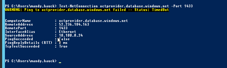 Die gelbe Warnung beschreibt den Ping-Versuch der SQL-Datenbank auf Azure - dieser klappt für gewöhnlich nicht und muss nicht weiter beachtet werden.