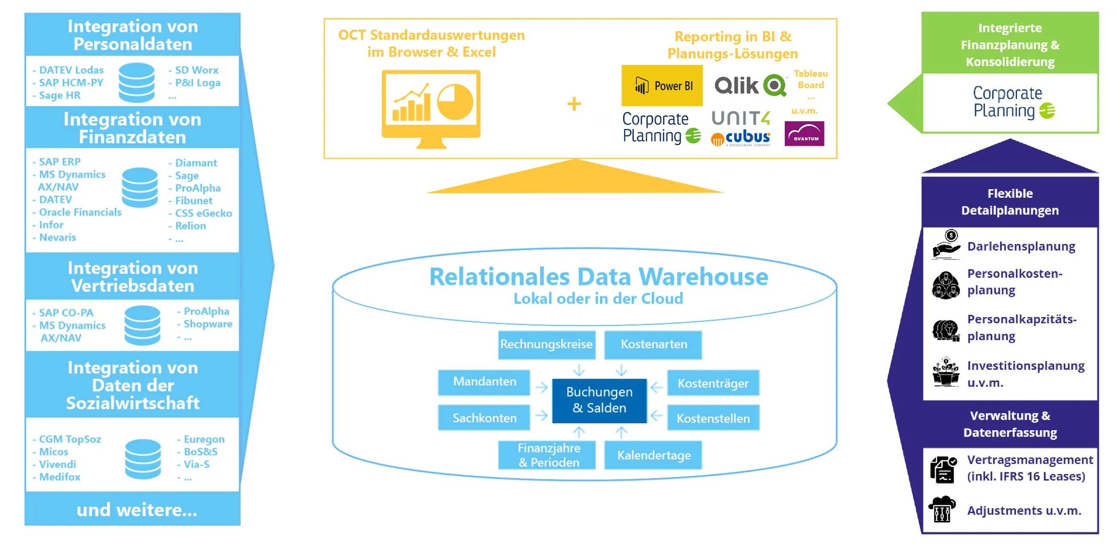 Deshalb haben wir mit OCT eine Lösung geschaffen, die die Einfachheit und Flexibilität von Excel mit der Sicherheit und Performance einer zentralen Datenhaltung in einer Microsoft-SQL-Datenbank, dem Data-Warehouse, verbindet und die vielfältigste Datenintegration von Vorsystemen am Markt bietet. Somit sparen Sie beim Ist-Reporting nicht nur Zeit, sondern auch in dezentralen Planungs- oder Verwaltungsprozessen im Unternehmen viel Aufwand.