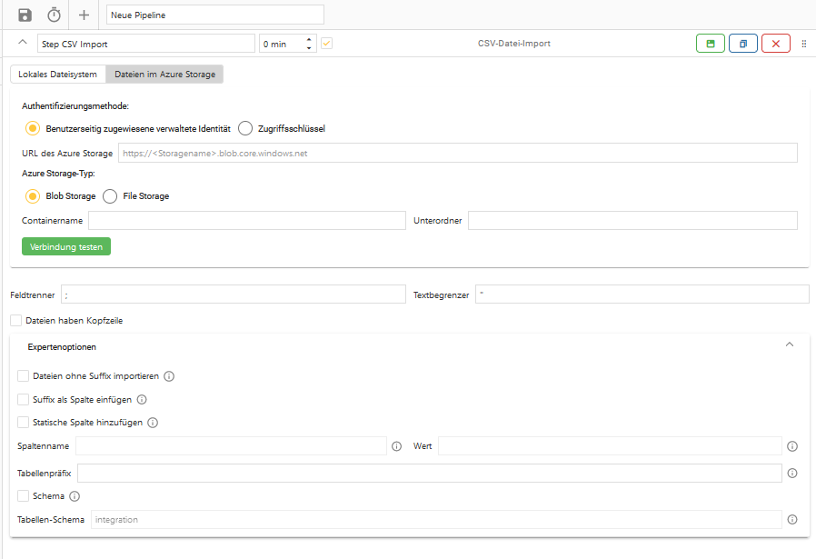 Wenn der Azure Blob Storage ausgewählt wurde, gibt es außerdem die Authentifizierungsarten per Zugriffsschlüssel (Standard für Endbenutzer) und per Benutzerseitig zugewiesener verwalteter Identität (nur für Experten).