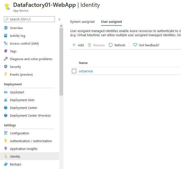Anschließend muss diese Managed Identity unter dem Menüpunkt “Identity” zur Webapp hinzugefügt werden sowie zu den einzelnen Deployment Slots: