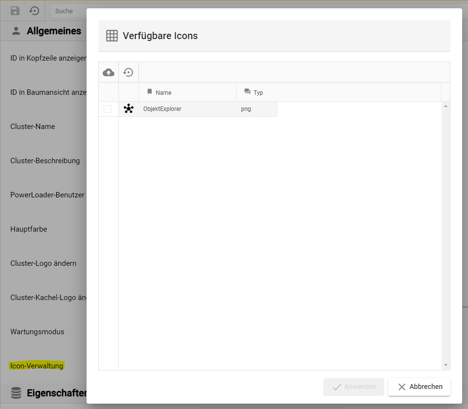 Öffnet den Dialog: “Verfügbare Icons”. Die Auswahl für das Werk-Icon erfolgt aus den (im Dialog) hochgeladenen Icons.
