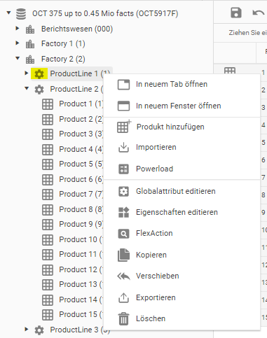 Vollständiges Kontextmenü eines Produktes im “ProductLine”-Tab