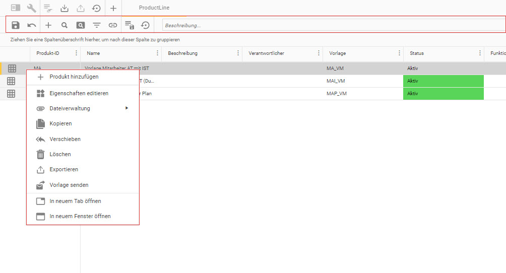 Vollständige Hauptmenüleiste des “ProductLine”-Tabs