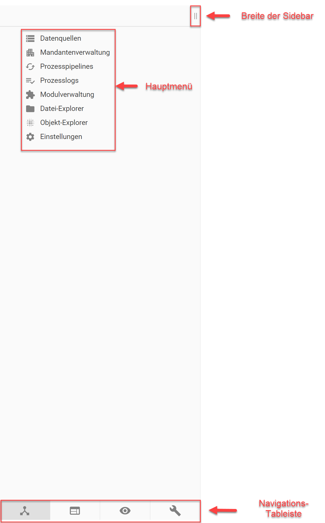 Ein Schieber (zwei vertikale Striche) stellt die Breite des Hauptmenüs ein.