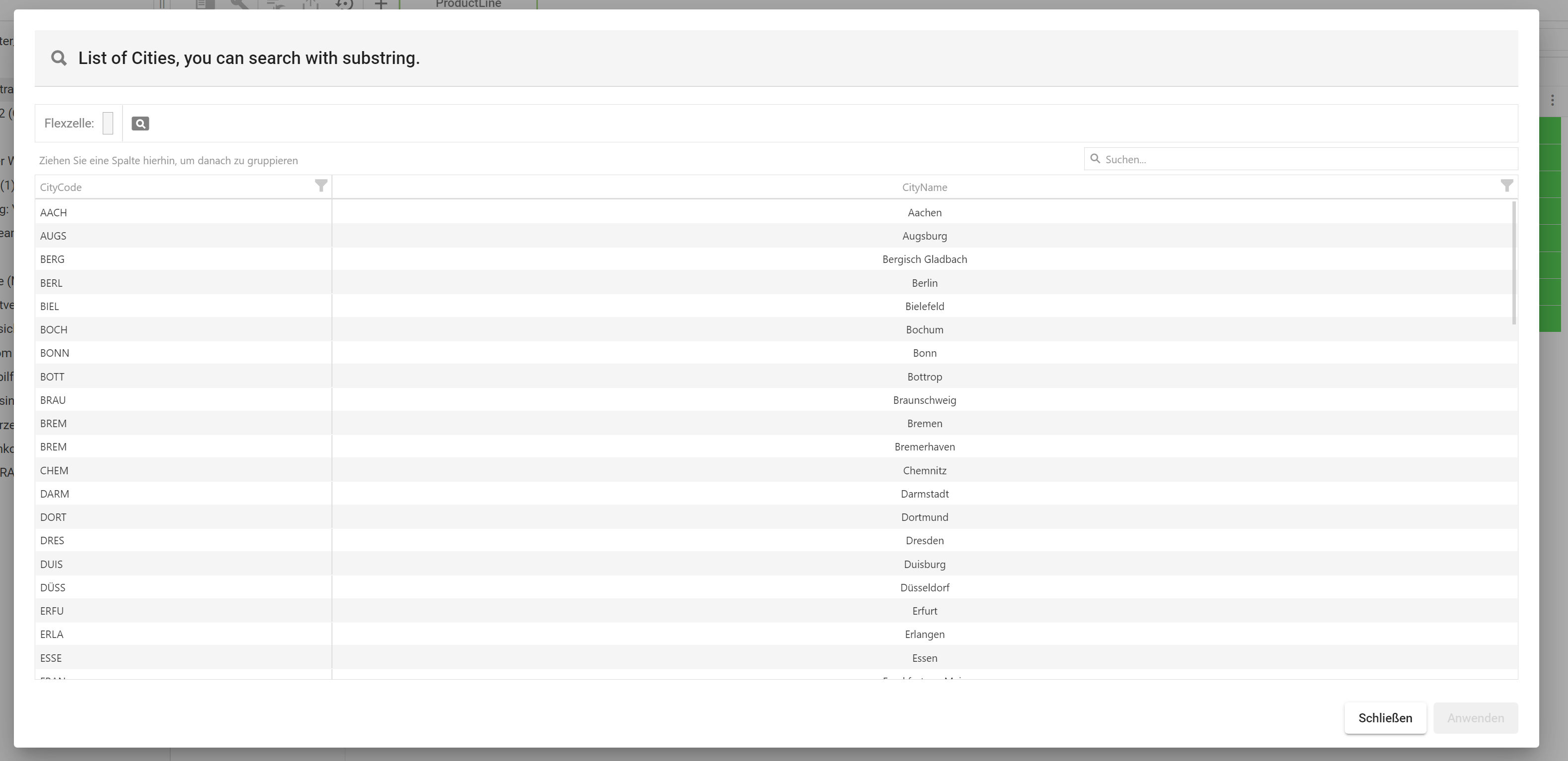 Wird eine FlexSearch ausgelöst, so öffnet sich ein (individualisierbarer) Dialog. Dieses Fenster enthält im Default-Zustand eine Liste mit Städten.