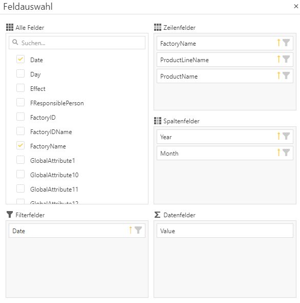Es bildet sich bei den Zeilenköpfen in der Tabelle ein ausklappbarer Baum mit mehreren Ebenen. Das am weitesten Oben platzierte Feld im Auswahlbereich Zeilenfelder (Menü - Feldauswahl), ist gleichzeitig auch die höchste Ebene bei den Zeilenköpfen der Tabelle.