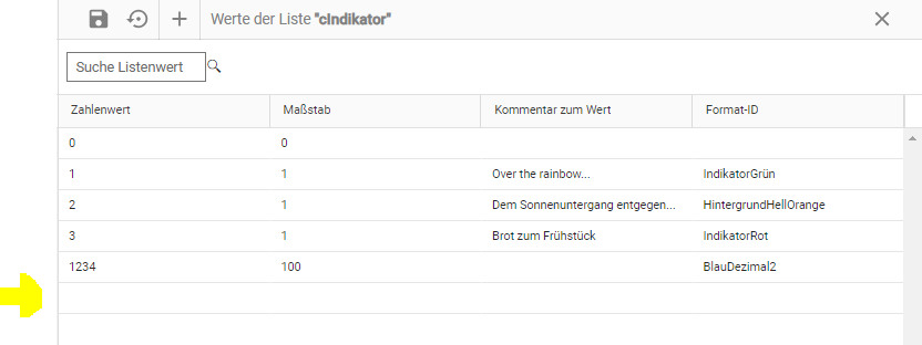 Der Name, bzw. die Beschreibung rechts der Hauptmenüleiste setzt sich wie folgt zusammen: Werte der Liste “<Listen-ID>”. Am unten gezeigten Beispiel ist die Listen-ID = “cIndikator”.