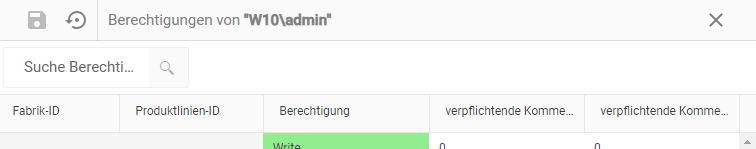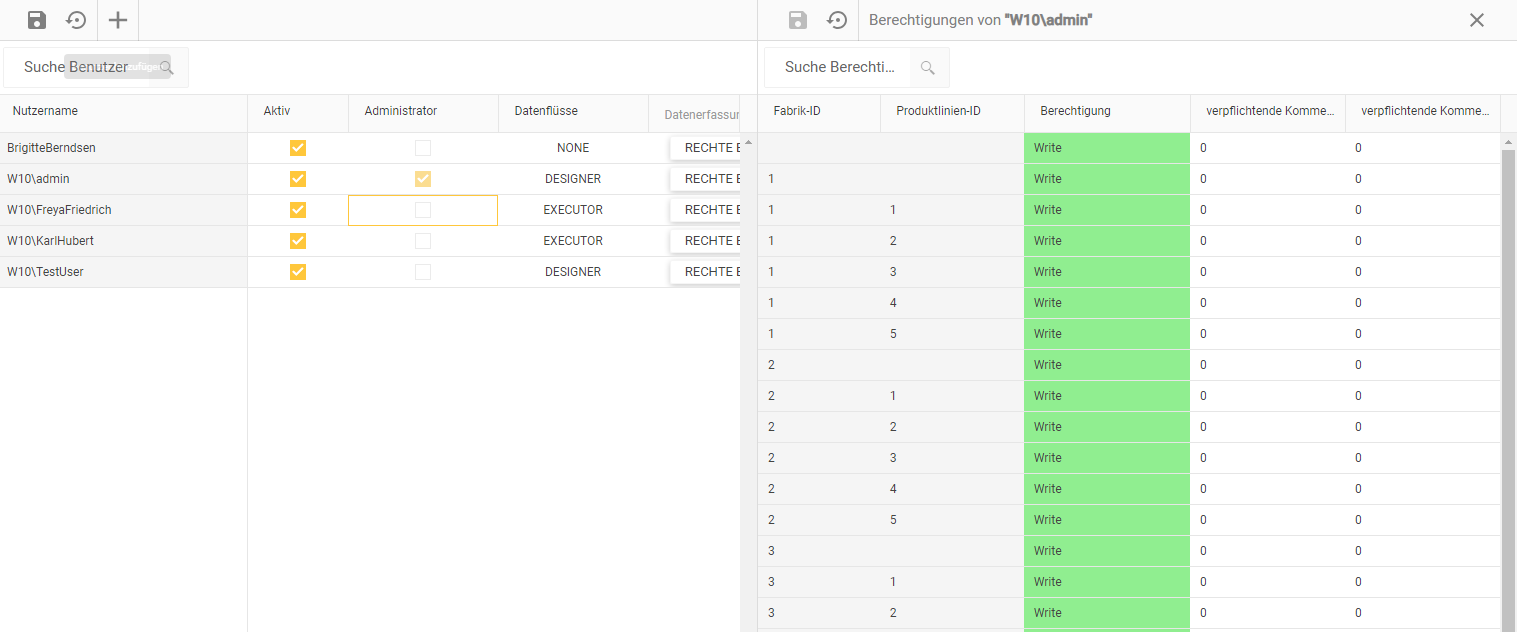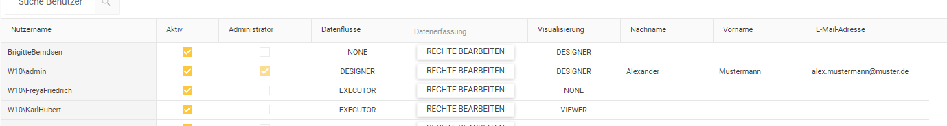 Die Tabelle zeigt alle Benutzer, deren Eigenschaften und die dazugehörigen Berechtigungen (für diese OCT-Datenbank) an.