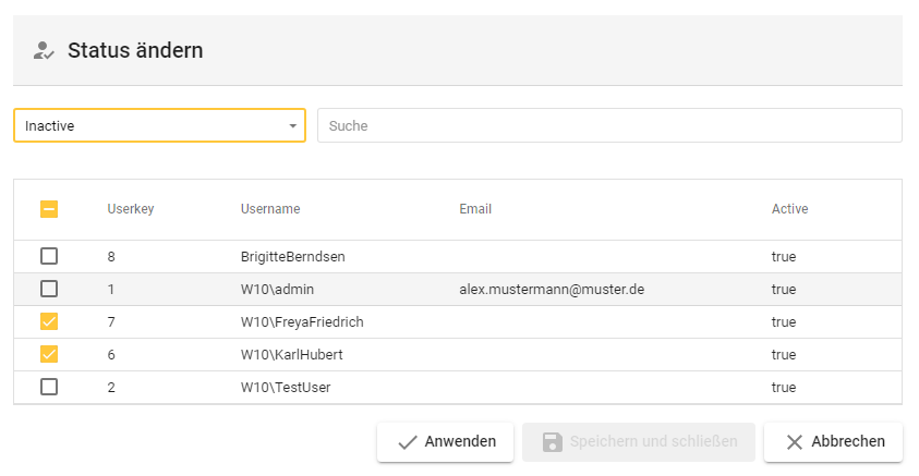 Man kann als Administrator weder die eigenen Berechtigungen ändern/reduzieren, noch den Status auf inaktiv stellen. |