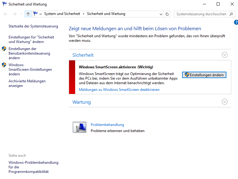 Dialog: “Sicherheit und Wartung” - Menü in der Windows-Systemsteuerung