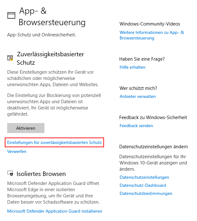 Öffnen Sie “Windows-Sicherheit” - “App- und Browsersteuerung”.