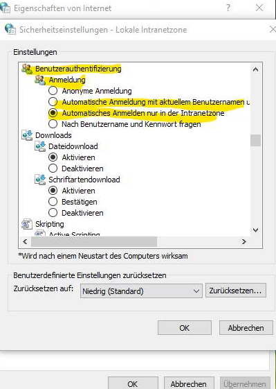 In den Windows-Interneteinstellungen die Sicherheitseinstellungen für die lokale Intranetzone bearbeiten: