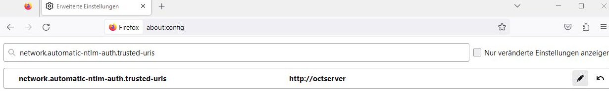 In die Adressleiste “about:config” eingeben und nach der Einstellung “network.automatic-ntlm-auth.trusted-uris” suchen.