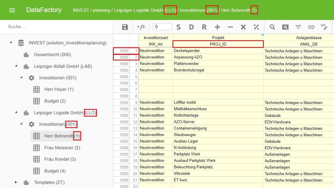 Die Factory-ID, die ProductLine-ID sowie die Product-ID sind hier an zwei Stellen ablesbar: Einerseits in der Pfadleiste am oberen Bildschirmrand, sobald das gewünschte Product geöffnet wurde, sowie andererseits im Navigationsbaum. Die ValueSeries-ID kann innerhalb des Produktblatts an der horizontalen Achse abgelesen werden. Die Time-ID kann hier an der vertikalen Achse abgelesen werden. Für den Fall, dass das Produktblatt othogonal gedreht ist, können die Time-IDs auf der horizontalen Achse und die ValueSeries-IDs auf der verikalen Achse gefunden werden.