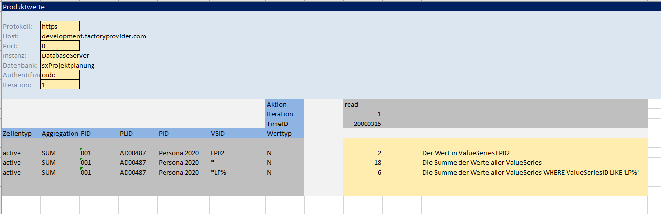 - Beispiel: *LP% findet die ValueSeries-IDs "LP", "LP001", "LP_neu" usw. Es wird anschließend mit der Aggregation SUM die Summe aller Werte der passenden ValueSeries-IDs für die Time-ID 20000315 ermittelt