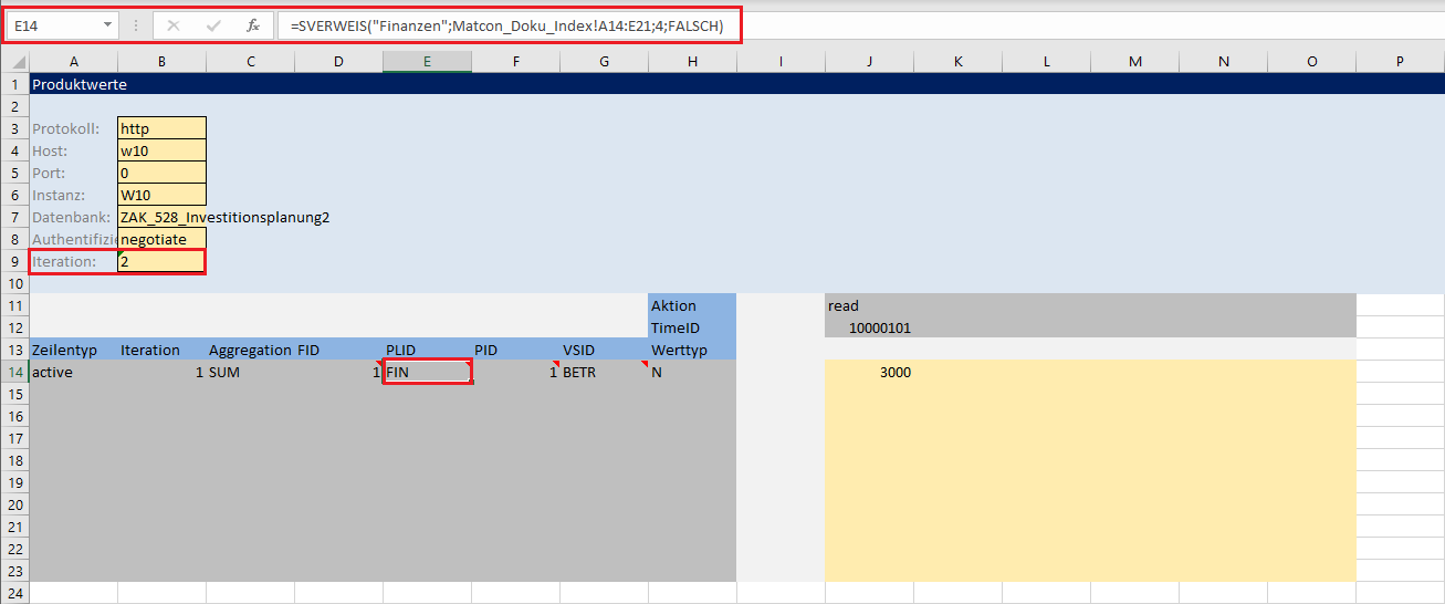 - Der SVERWEIS in Zelle E14 des Produktwertblatts übernimmt die ProductLine-ID der ProductLine Finanzen