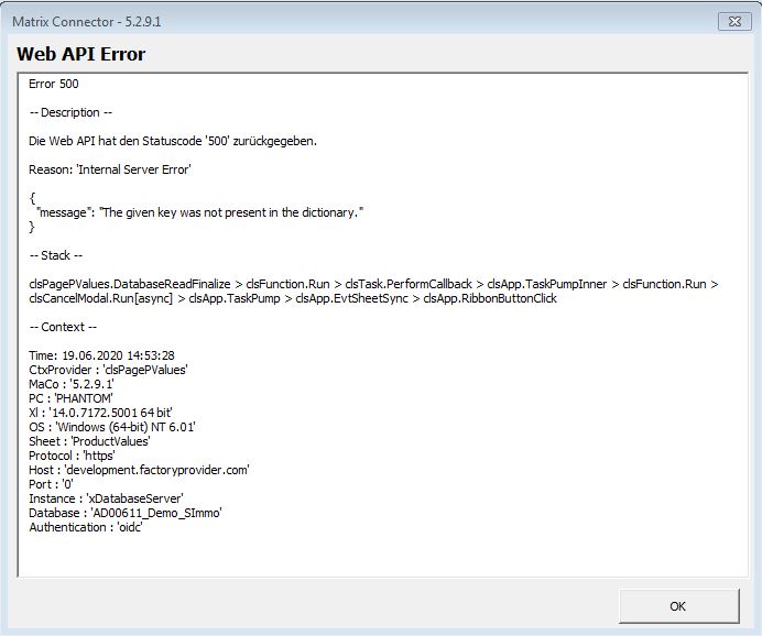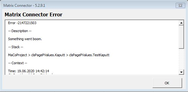 Neben dem meist vorhandenen Fehlercode und der immer vorhandenen Beschreibung enthalten alle Ausnahmefehler außerdem Informationen zum Funktionsstack und zusätzliche Kontextinformationen. In den Kontextinformationen (falls vorhanden) verstecken sich unter anderem der Name des Excelsheets und der Verbindungseinstellungen. Die Ausnahmefehler Userform kann im Übrigen in ihrer Größe geändert werden.