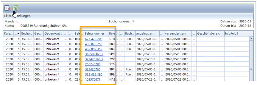 Ist für einen Buchungssatz ein Beleg verfügbar, ist die Belegnummer mit einem Link hinterlegt. Diese Belegnummer ist klickbar.