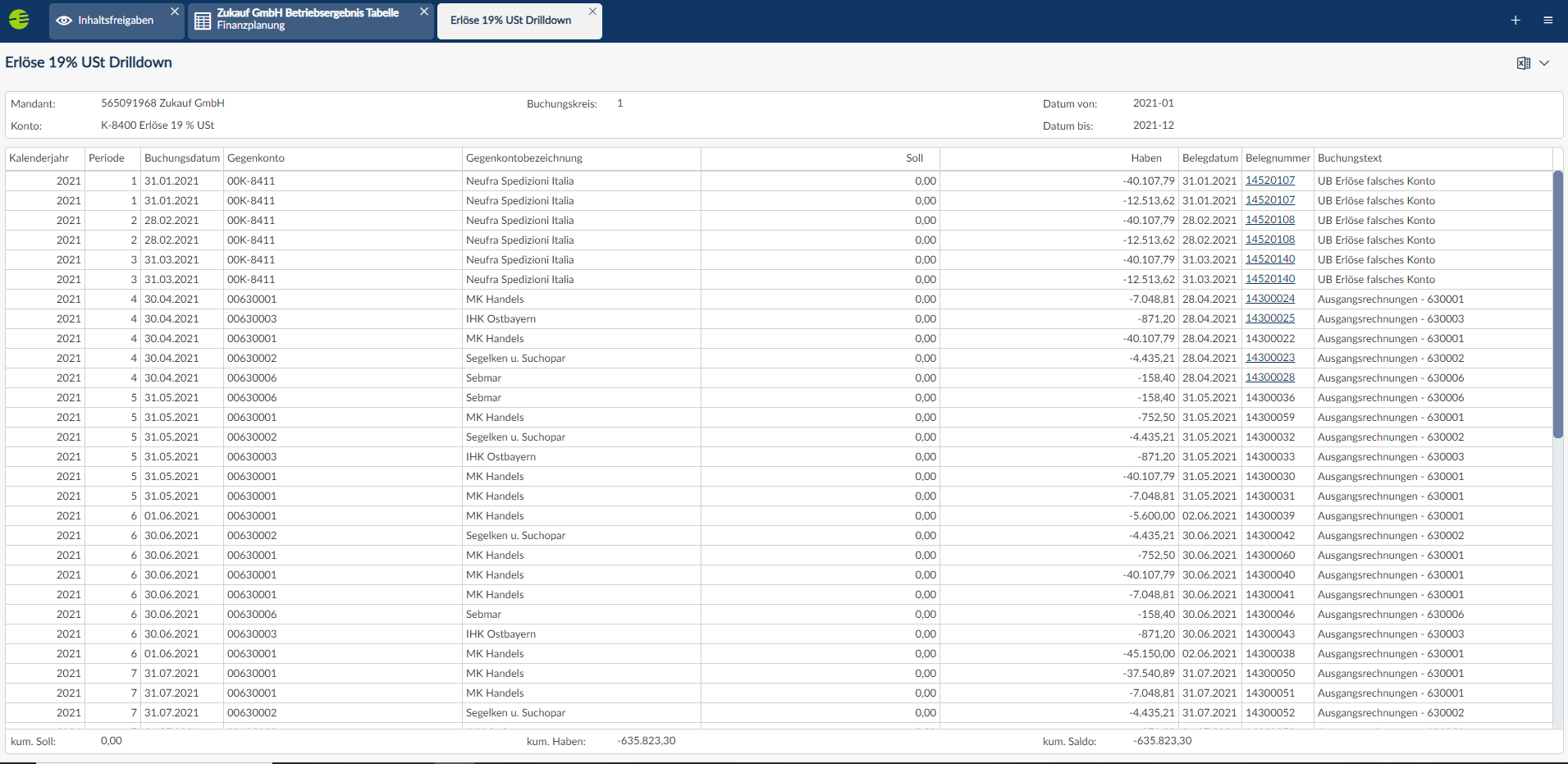Zunächst ist in CP für eine Konto-/Perioden-Kombination der Drilldown auszuführen. In dem sich öffnenden Drilldown-Fenster werden die zugehörigen Buchungssätze angezeigt.