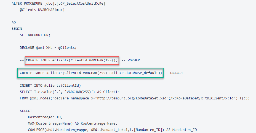 Im beim Kunden vorgefundenen Zustand besaßen die Instanzen auf dem neuen SQLServer (sowohl CP als auch CPCE) die Collation "SQL_Latin1_General_CP1_CI_AS".